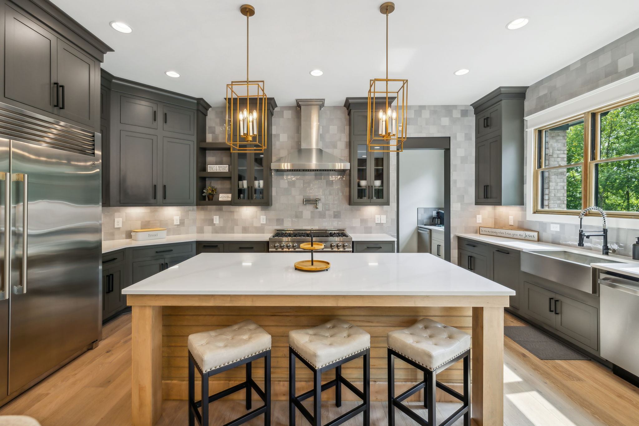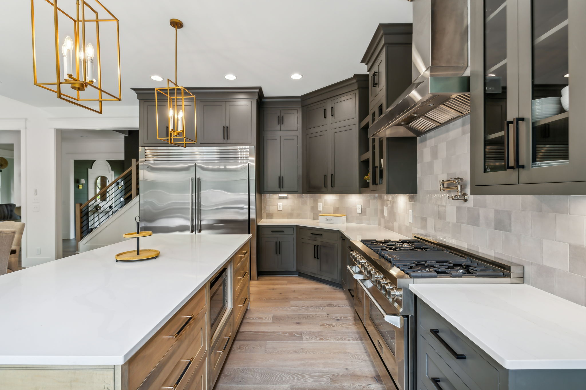 Chef’s Kitchen: Quartz countertops, 48” gas cooktop, double ovens, oversized refrigerator, and a separate prep pantry.