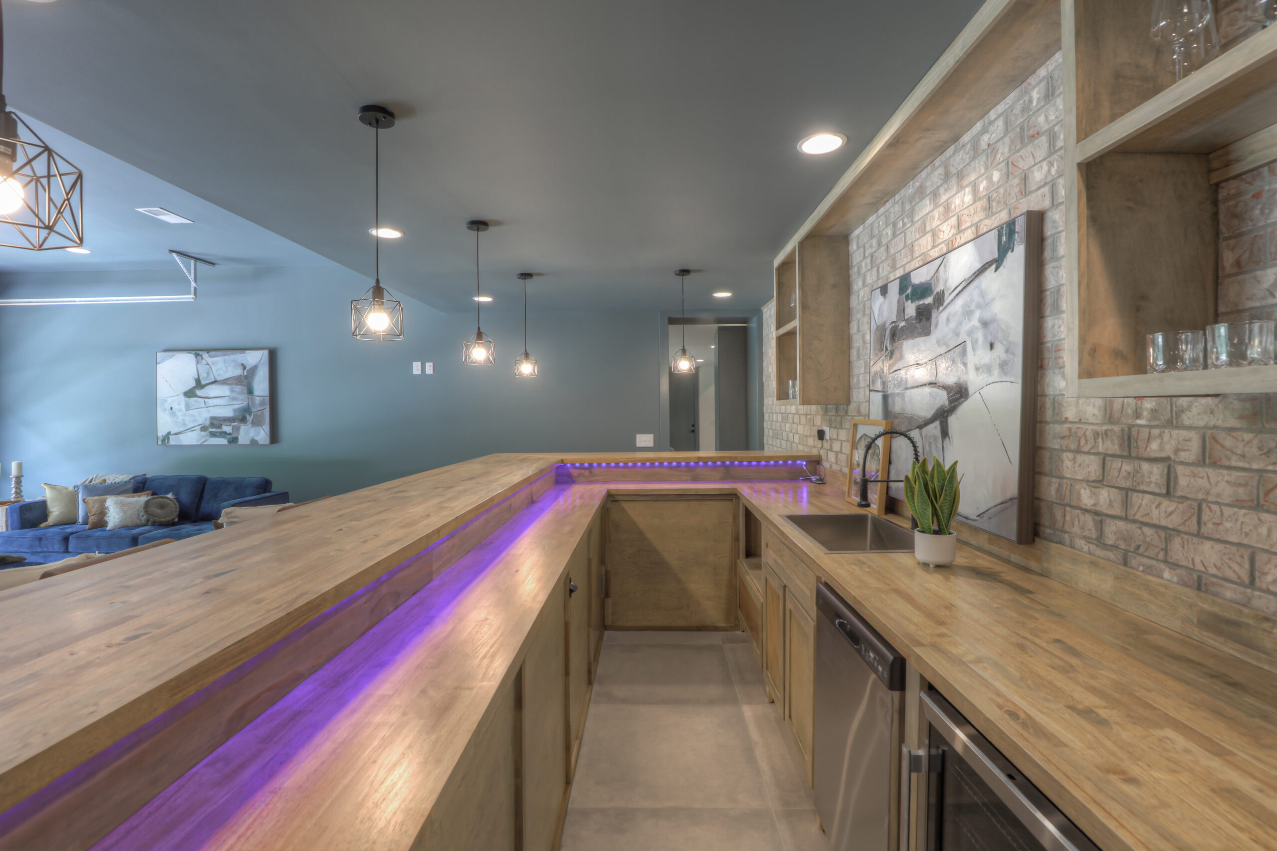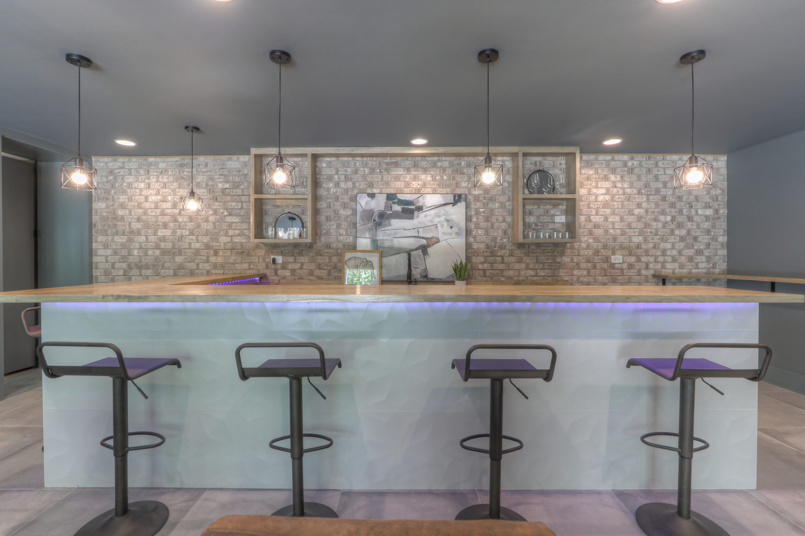 Hidden Murphy door revealing a custom sports bar—complete with glass doors that open to the lakefront patio.