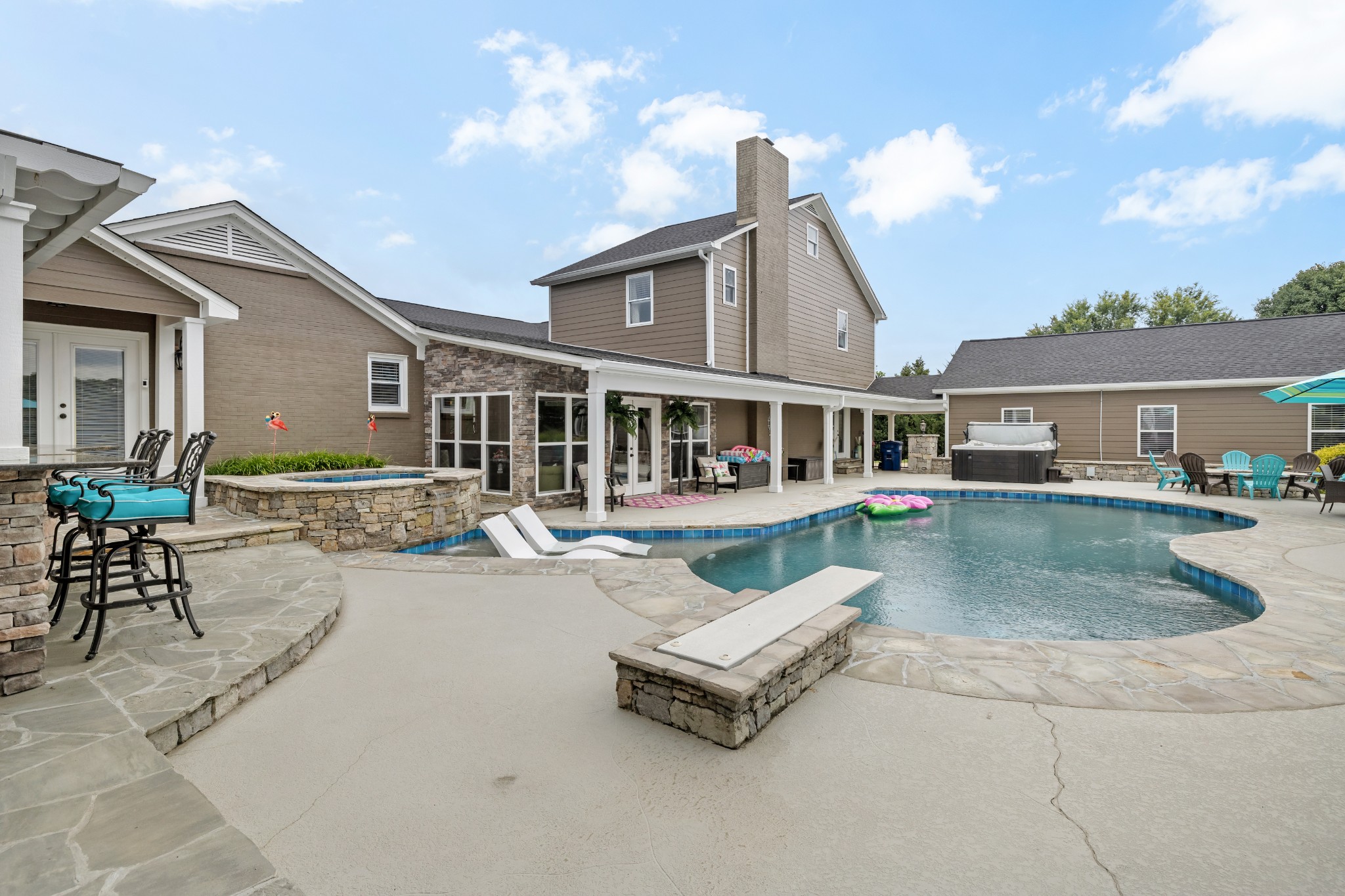 Resort-Style Living: Gunite saltwater pool with two hot tubs, surrounded by lush landscaping and panoramic views.
