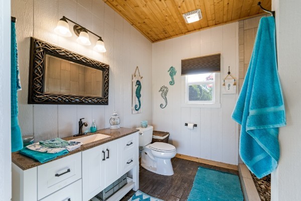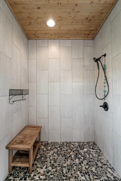Guest Convenience: A full restroom designed to serve poolside and outdoor spaces.